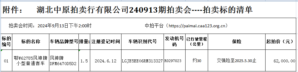 受委托,本公司定于2024年9月13日下午2:00時(延時的除外)在中拍平臺(https://paimai.caa123.org.cn)舉行拍賣會,公開拍賣風(fēng)神牌小型普通客車一輛。